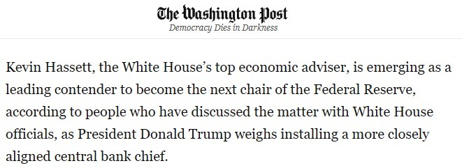 值得一提的是,这次“出头”向鲍威尔发难的哈塞特,据称也是特朗普眼里下任美联储主席的潜在人选。美国《华盛顿邮报》称他“在下任美联储主席的竞争中领先”。